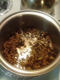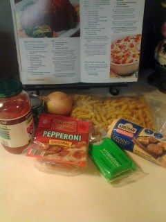 1.) In a large skillet, cook beef and onion over medium heat until meat is no longer pink; drain. Stir in spaghetti sauce and pasta. (Make sure you actually cook the pasta first. I totally forgot to do that last night when making dinner. The hazards of trying to cook dinner with two small children screaming at you)