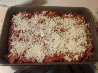 2.) Transfer to two greased 13-in x 9-in x 2-in. baking dishes. Sprinkle with cheese. Arrange pepperoni over the top.