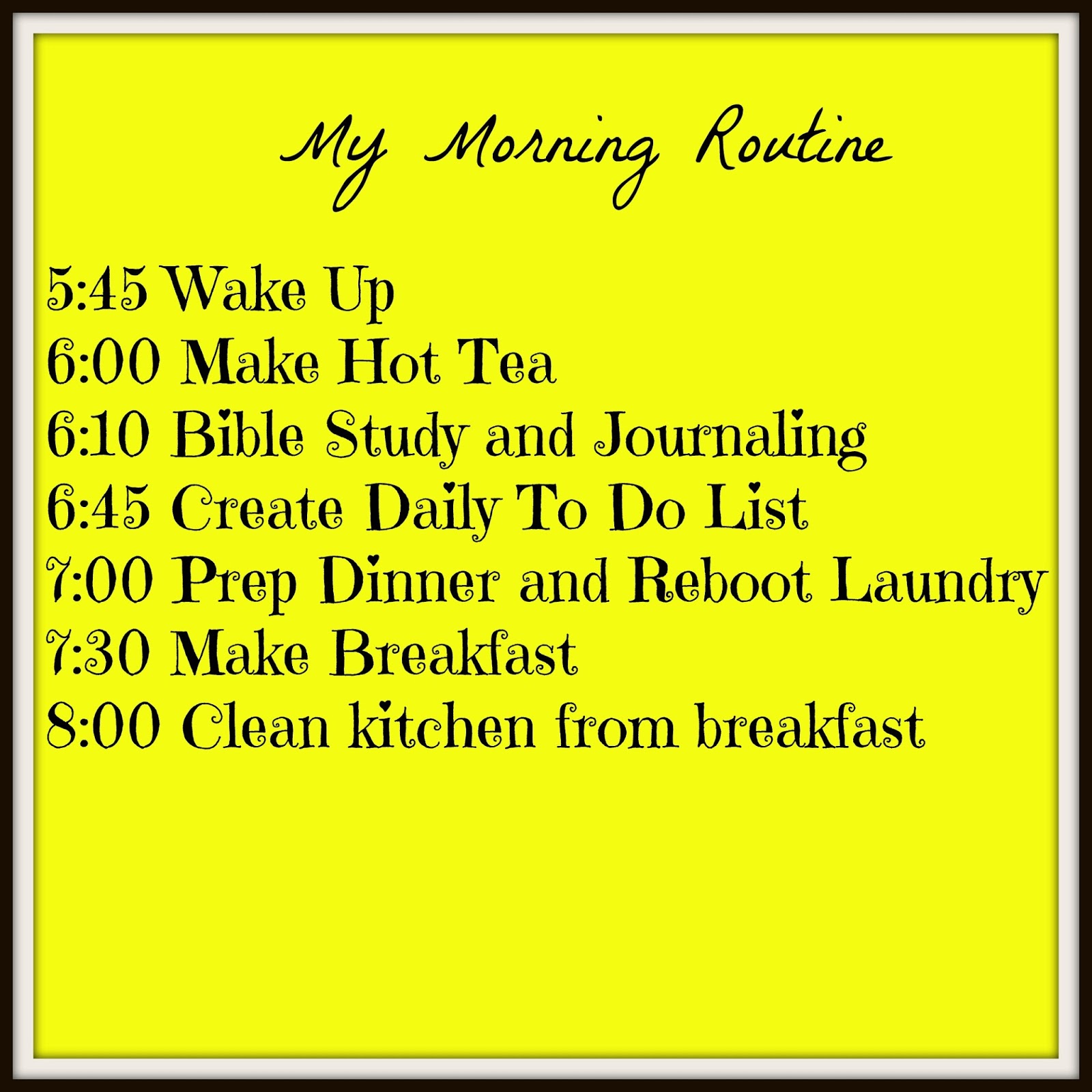 One thing that has already changed in my morning routine is my waking up and making that first cup of hot tea. For the last week I have been skipping the hot drink and going straight for my workout. That has also meant that my Bible Study and quiet time has been pushed back. Luckily, I have been able to get most of everything else done around the same times (except creating the to-do list)
