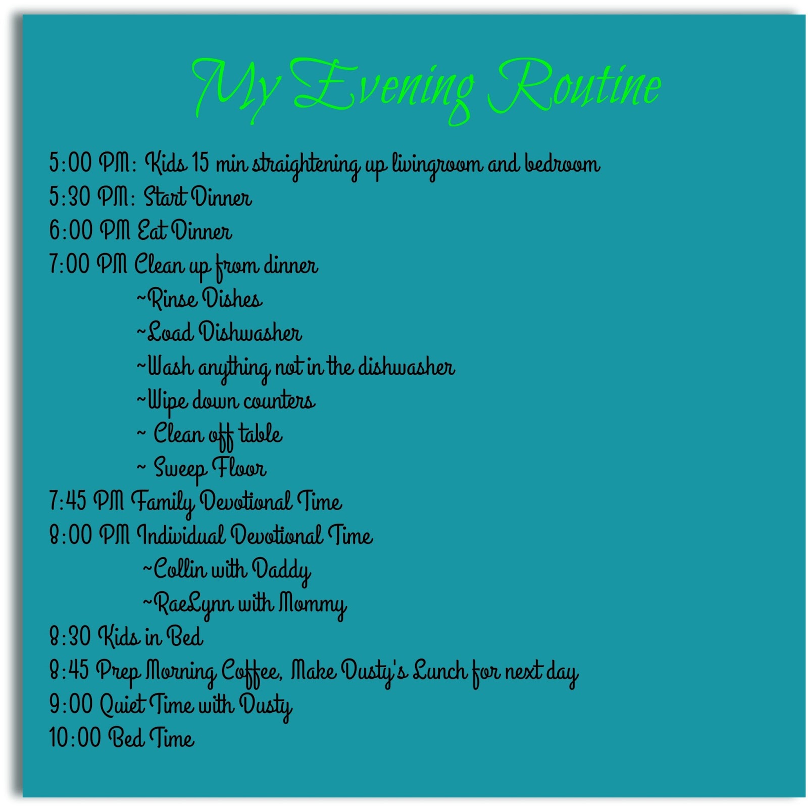 Of course, during the process of “making over my mornings” my husband made a job change that has required him to be gone more nights than he is home. So this means that I am going to have to take a look at my evening routine and re-evaluate how that will go. I am most likely also going to have to look at my morning routine and reset that as well.