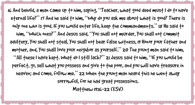 From there Jen goes on to highlight that no where does “being rich” and “having stuff”come out smelling like roses in the Bible. In facet, in Matthew 19:16-22 we find out being rich makes things very hard when striving to follow Christ.