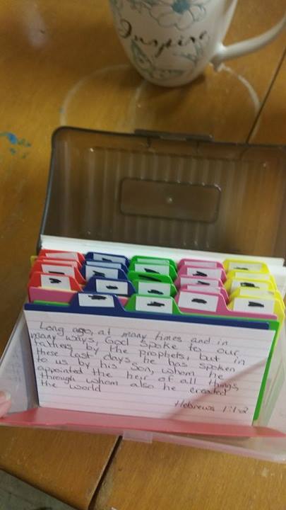 I created our memory verse box following an example on Simply Charlotte Mason. Luckily, we had a extra card box and the dividers.  I will take some time soon to walk through how that system works, but for now here is what we have going.