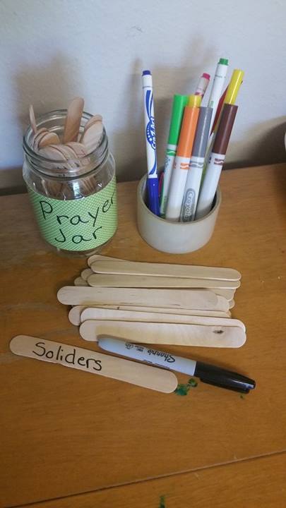 With a mason jar, some cute scrapbook paper, and large Popsicle sticks our Prayer Jar was born. Each stick has a name written on it. When prayer time rolls around each child gets to pull out one of the sticks and they get to pray for who ever is written on the stick. I also pull out a stick. We take turns going around and we pray for who is on our stick then I finish up prayer time by reading the prayer at the end of the day’s devotion. The kids have enjoyed this so much they beg to pull out more than one stick at a time and ask if we can use the prayer jar at meal times and before bed prayers!