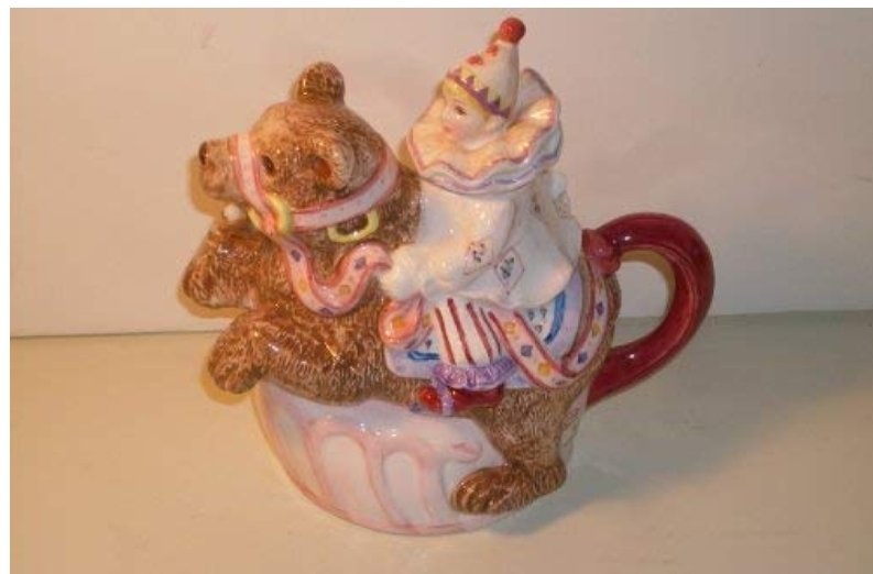 This is a Schmid Circus Bear with Clown teapot. But it’s not just any teapot. It is also a music box. It’s fun because when it is wound correctly every time it is picked up to pour out the tea the music will play. Once it is set back down again the music will stop. This is one in a series of five or so and the original plan was to eventually get me the whole set but that wasn’t ever in the cards. This one is not only my first in my collection it is my most unique, which makes it one of my favorites.